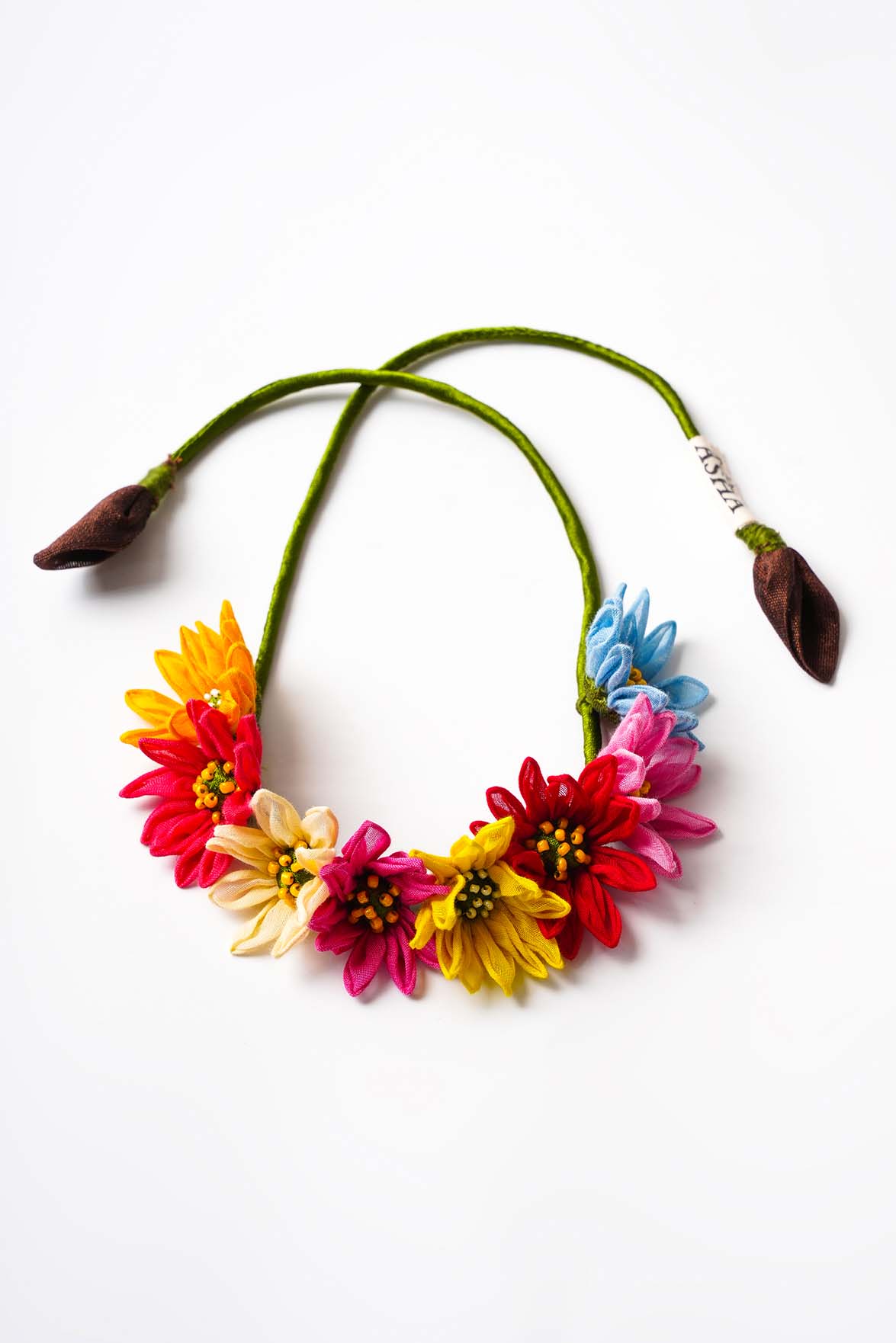 Material: Woven Chanderi Fabric flower, Glass beads, Metal Ghungroo.